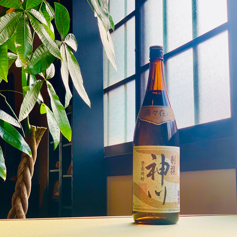 「滴々在心」、一滴一滴に真心をこめて丁寧に造りあげられる蔵元こだわりの芋焼酎「別撰神川」。